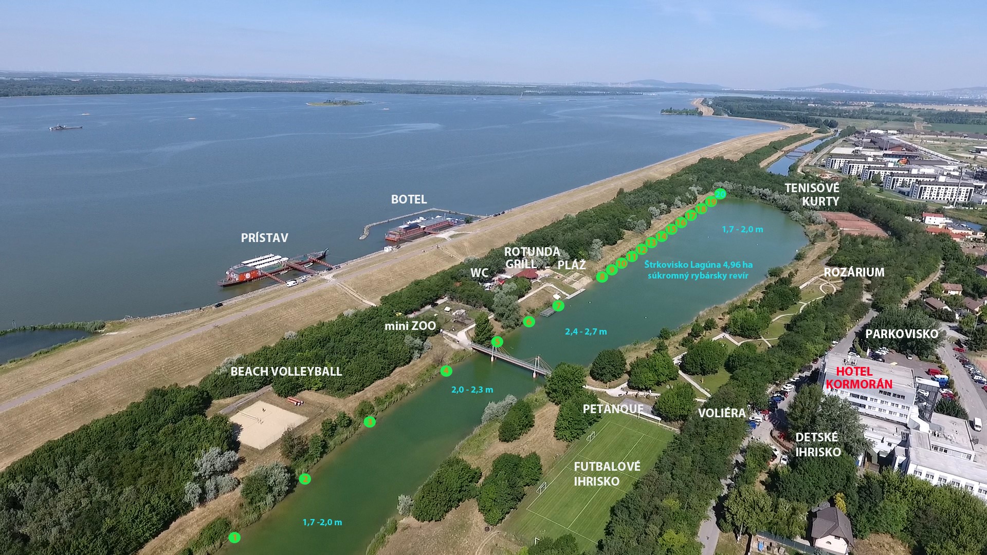 Hotel leží na medzinárodnej cyklistickej trase Bratislava – Budapešť – Viedeň a od Bratislavy je vzdialený 20 km, od Viedne 75 km a od maďarských hraníc 35 km. Súčasťou hotela je i prístav s botelom, ktorý poskytuje vodným turistom, cyklistom ako aj ostatným klientom oázu ticha a pohody.